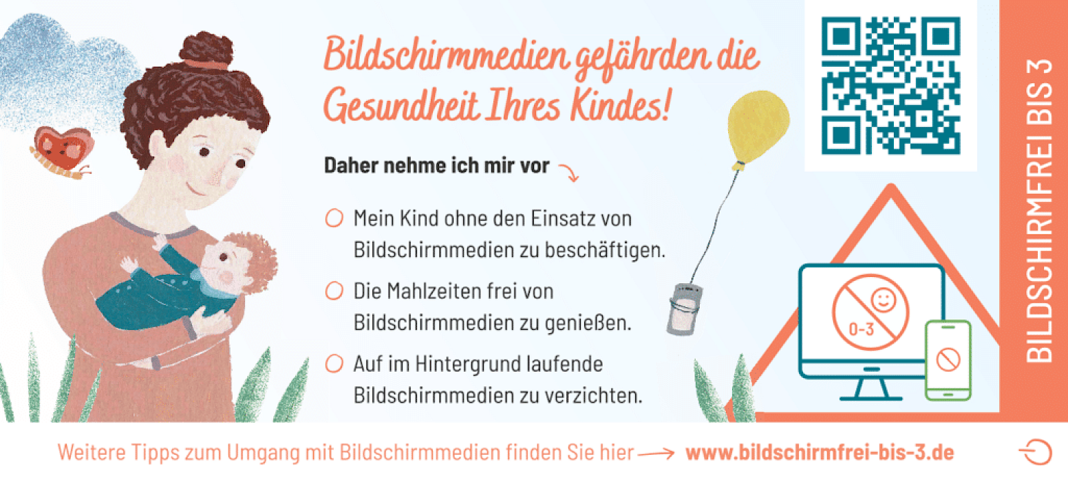 Bei der Initiative Bildschirmfrei bis 3 finde Sie weitere Informationen über die Nutzung von Handy, Tablets und Fernsehen bei Kleinkindern. Die Webseite zeigt die Folgen von früher Mediennutzung und welche Alternativen Eltern haben.